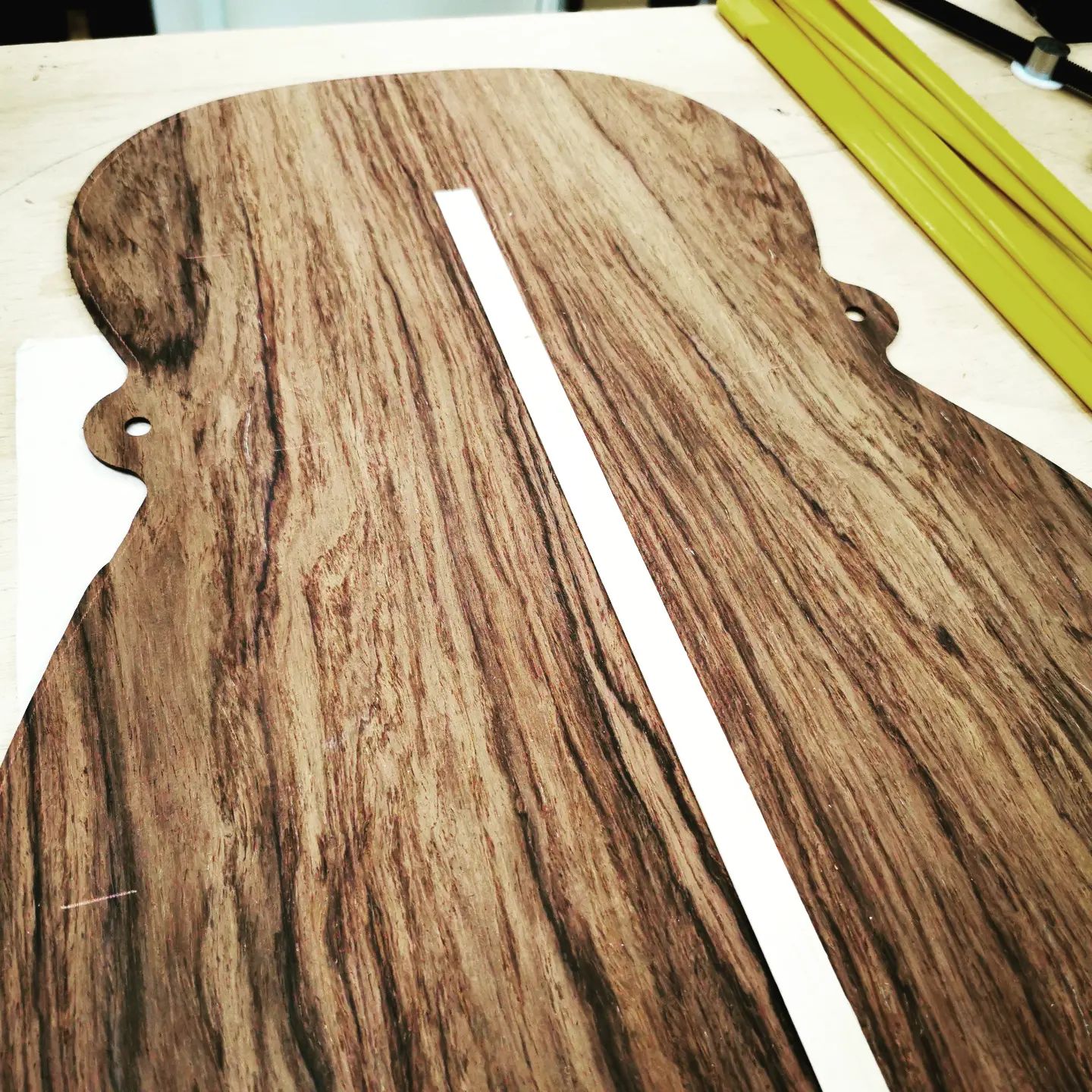 做傳統款西班牙結他時我用的背板厚度約為1.9mm 而最終成品經過打磨後會再薄一些。而中線側是用雲板面板的碎料,約0.8mm厚,15mm闊。